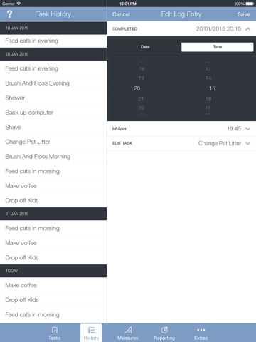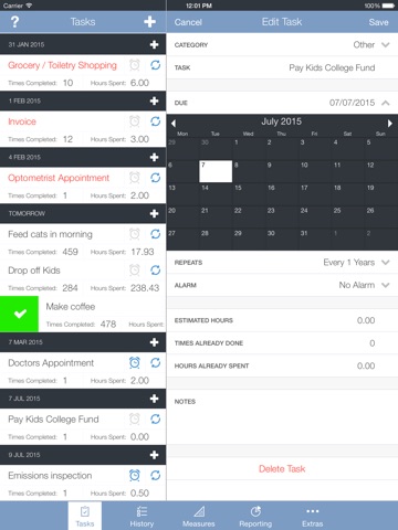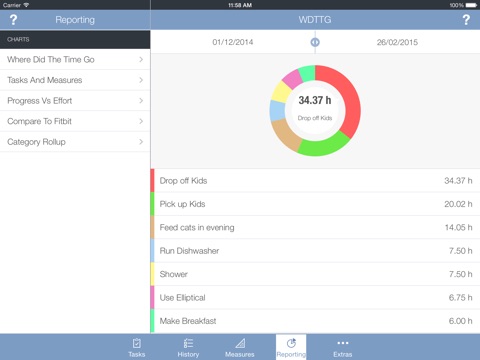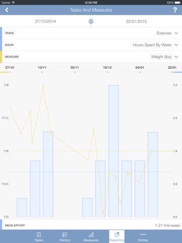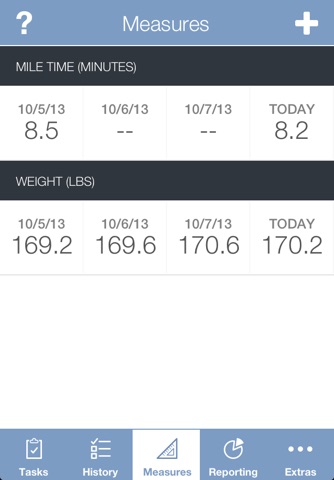 T&M combines task management and self-tracking into one app. It logs each task you perform and keeps count of how many times youve performed it and how much time youve spent on it. It also lets you easily track daily measurements for everything from your weight and best mile time to the number of vocabulary words in a foreign language youve mastered. You can then use built in charts and graphs to see where your time is going and compare and chart the effort your putting into a task (like running, or touch typing lessons) against the progress your making on a related measure youre tracking (e.g. best mile time, words typed per minute) or against health & fitness measures tracked in the HealthKit and the Fitbit platforms