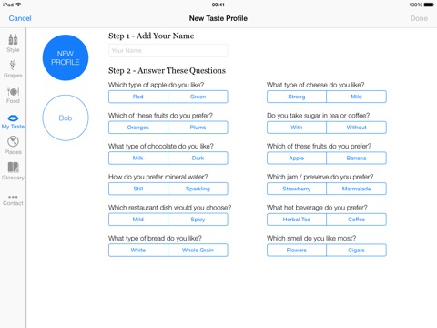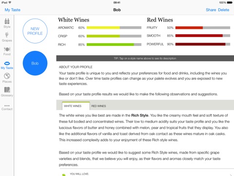 Pocket Wine has pioneered this unique approach to wine, providing you with your own personal wine taste profile. All you have to do is answer a short set of carefully designed questions on the foods you like and the app will reveal your taste profile. This profile indicates your preference for each of the 6 main table wine styles (3 for white wine and 3 for red). In addition to a commentary on your profile, you will also receive recommendations for grape varieties you will love and ones you must try, as well as an adventurous choice and one to add to your wine wish list. Whether you are new to wine, or an experienced enthusiast, we believe you will enjoy this unique approach to wine, which we hope will be the start of a great wine adventure.