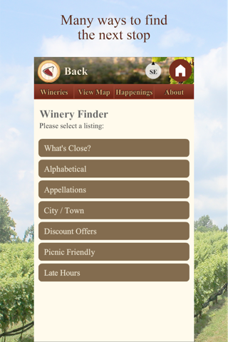 A Smartphone friendly application to find the next Virginia Winery Tasting Room to visit. You can sort by distance, discounts, varietal, closing times, cities and AVAs.