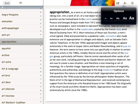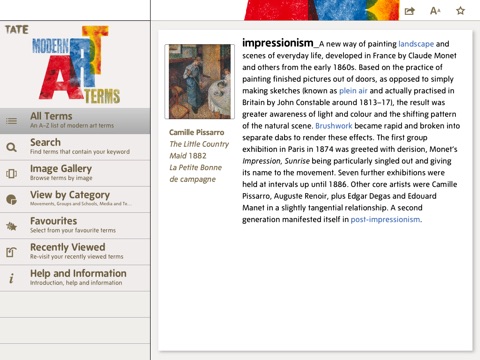 I love Art History and I love my iPad, but I really think this app could better. The writing is very good, but Im really surprised that this app doesnt have more illustrative examples. The Tates guide is very traditional approach to a reference book and it is fine at that, but it could be so much more.