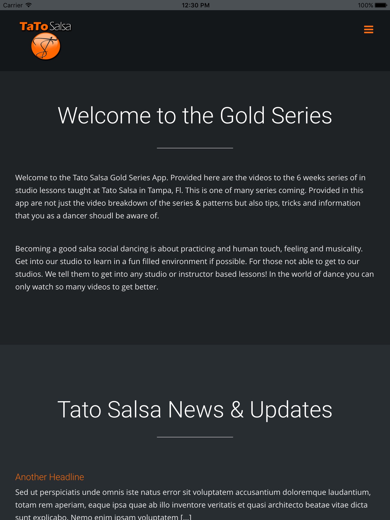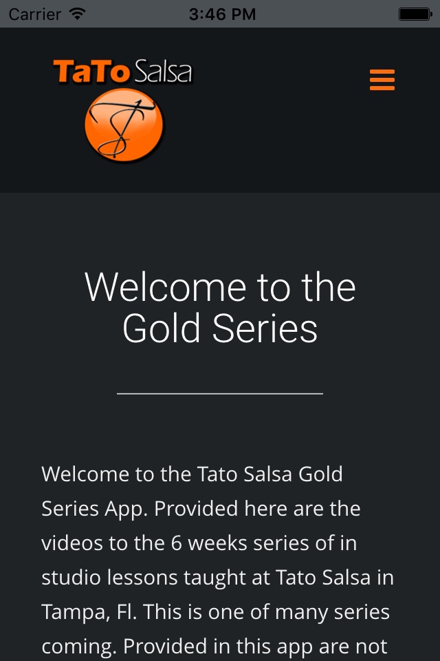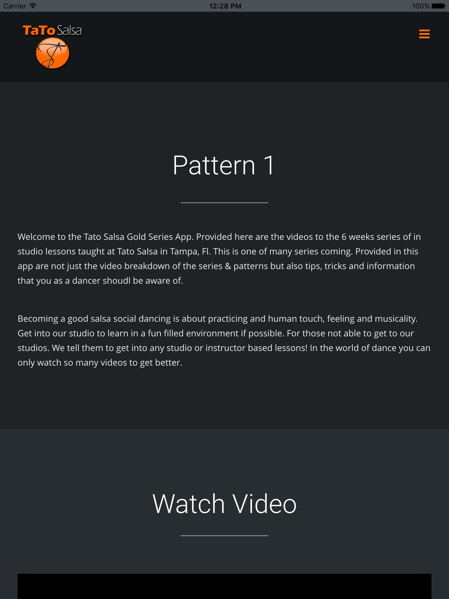 Welcome to the Tato Salsa Studio App. With this app you can access curriculum based patterns, moves, and more learned in the dance studio. No more needing to record, save, and store only to lose the videos over time. Now you can practice what you learned in the studio by simply firing up the app and watching what you went over.
