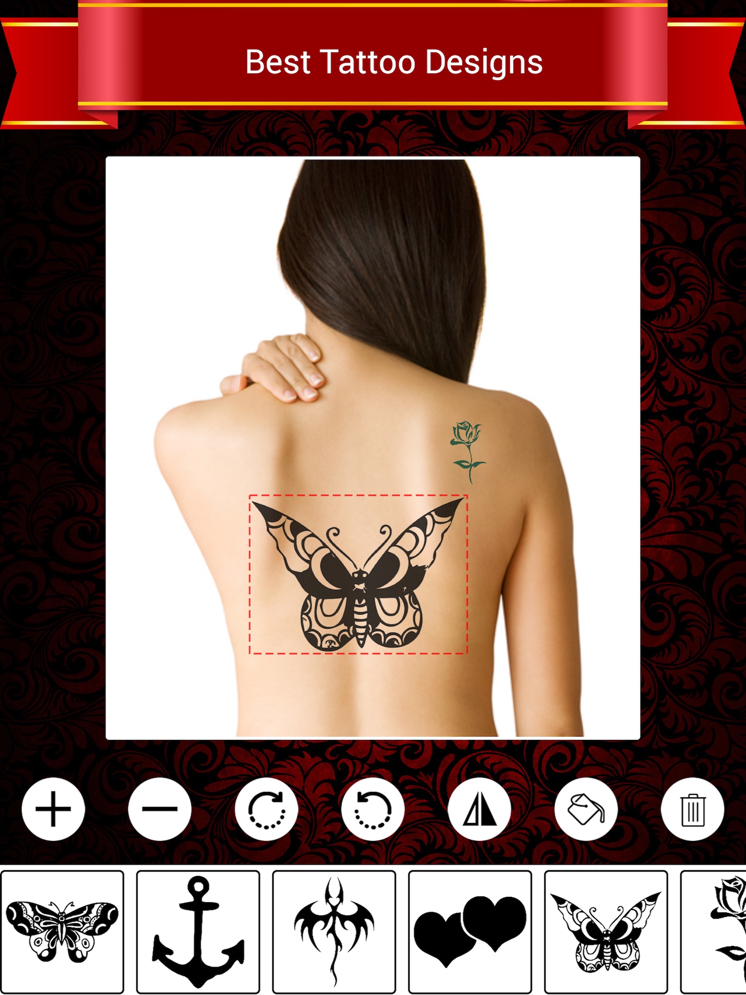 - Browse our many tattoos and place them anywhere on your photos, you control the size, rotation, color , flip and placement of the tattoo