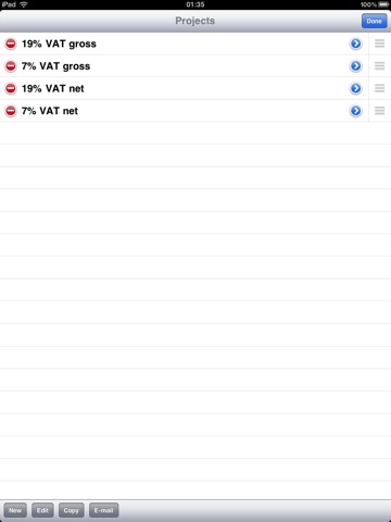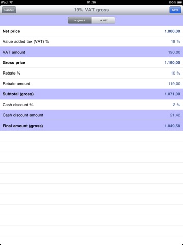 Calculation from net to gross and vice versa by one tap with the same values. Tax, rebate and cash discount are mentioned in percent and as amount, the rebate can be entered as amount and the percentage will be calculated.