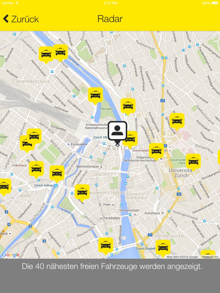 Bestellen Sie Ihr Taxi in Zürich und Umgebung mit zwei Klicks zu Ihrem Standort! Geben Sie Ihre Sonderwünsche bekannt und bestätigen Sie Ihre Bestellung. Die Anfahrt Ihres Taxis wird angezeigt. Bei Angabe einer Zieladresse sind auch Preisauskünfte möglich. Auch Vorbestellungen für eine Fahrt zu einem späteren Zeitpunkt werden unterstützt.