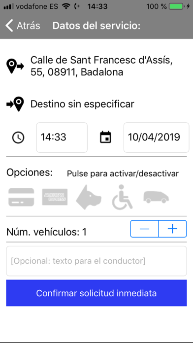 Una vez indicado su número de teléfono y activada la localización que proporciona su dispositivo, podrá solicitar su vehículo. Siempre se le indicará el taxi más cercano y, una vez solicitada la reserva, podrá ver el número de licencia, vehículo y nombre del conductor. Además, podrá ver la distancia a la que se encuentra su taxi hasta que sea recogido en el lugar indicado.