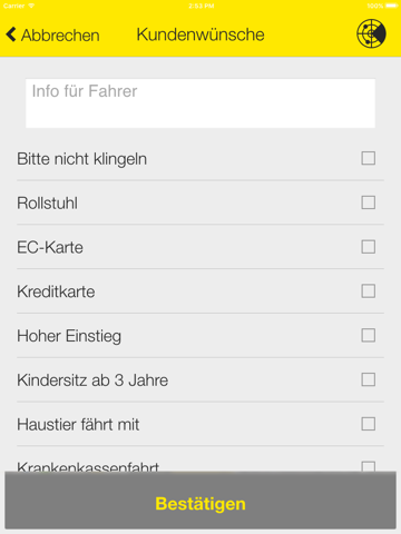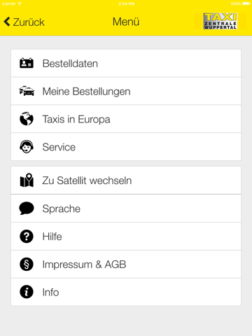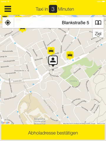 Bestellen Sie Ihr Taxi in Wuppertal und Umgebung mit zwei Klicks zu Ihrem Standort! Geben Sie Ihre Sonderwünsche bekannt und bestätigen Sie Ihre Bestellung. Die Anfahrt Ihres Taxis wird angezeigt. Bei Angabe einer Zieladresse sind auch Preisauskünfte möglich. Auch Vorbestellungen für eine Fahrt zu einem späteren Zeitpunkt werden unterstützt.