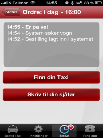 - Viser rute når du har bestilt, posisjon til taxi og estimert hentetid