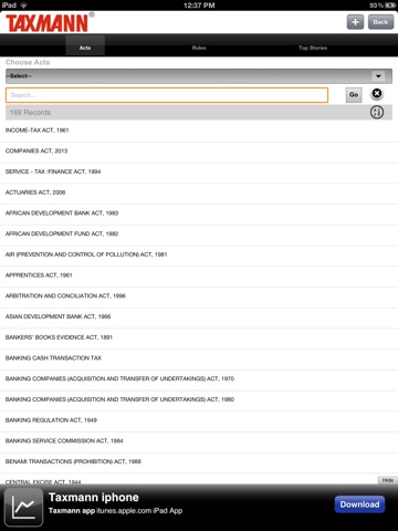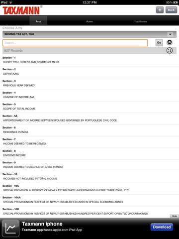 An iPhone application encompassing always updated 178 Acts and 383 Rules with their legislative history. The application has some unique features like Custom View (to rearrange section as per your usage), Split View (an option to read two provisions together). Latest updates and top stories of Indian tax and corporate Laws can be accessed from anywhere and anytime. Additional Features: Bookmarks, Notes, Save data in Offline mode, Taxmann’s Search.