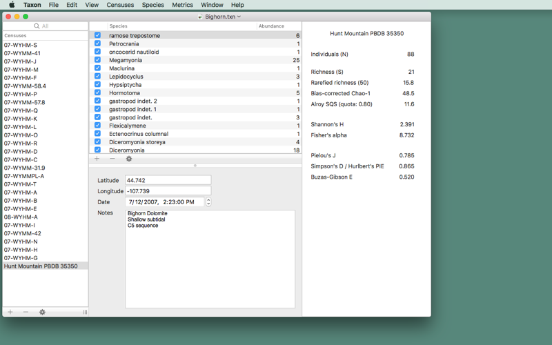 Taxon is the fastest and easiest way to enter your ecological census data, calculate common ecological metrics, and export your data for heavy-duty analysis in R. Taxon automatically calculates common diversity metrics (including Alroys SQS) on individual samples as well as your entire data set. Taxon calculates both individual-based and sample-based rarefaction, including great-looking plots with confidence intervals.