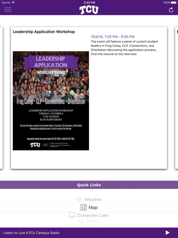 - Weather: Local TCU conditions, and a 7-day forecast