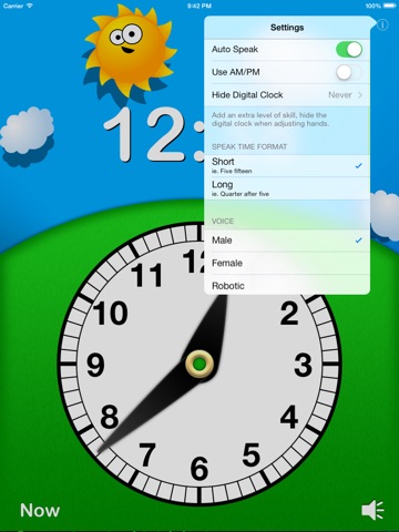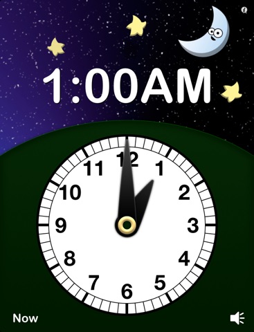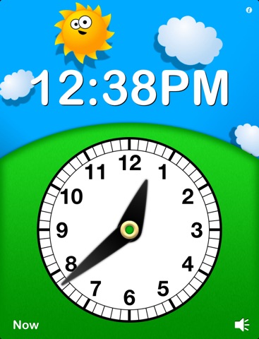 Adjust the hands and see and hear the time. Watch the sky change from day to night, to learn the difference between AM and PM. Touch the "Now" button to see and hear the current time. Option to hide the digits while adjusting the hands or always, to add an extra challenge.