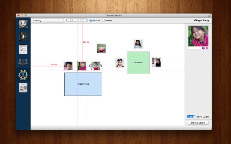 Seating - easily create a representation of your students seating arrangements. Just create objects and drag students around. Use a picture or stick with name plates.