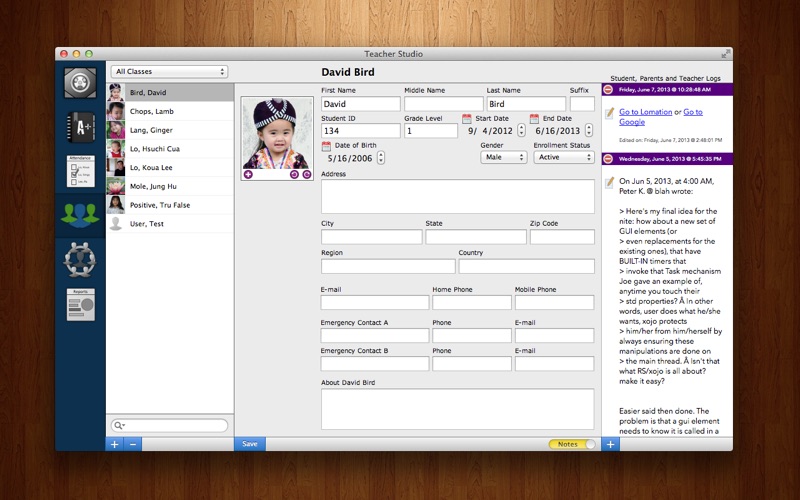 Students - contains student information, including the ability to write logs/blogs for each student (3 log types: teacher, parent and student). Keep a journal of the students progress. Log parent calls. Write down your thoughts.