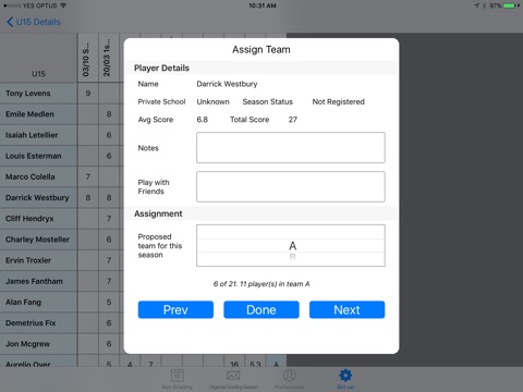 Use the grading scores for the player, player history and player notes to assist with team assignment.