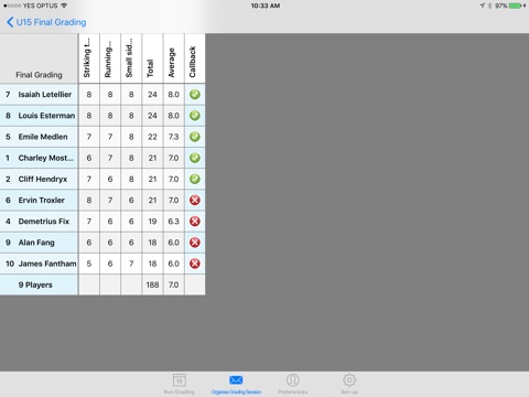 Review and sort the results in Team Grader and select players for a 2nd grading session or trial game.