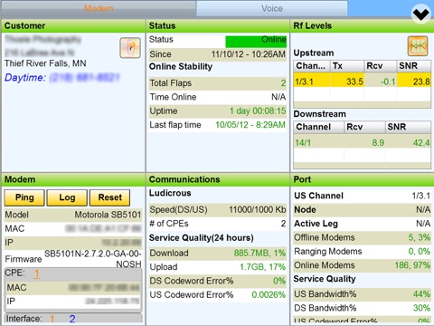 * View key modem and port statistics. On a single screen see a wealth of information, including the modem’s status, how long it’s been online, the number of flaps and the last flap time. Scroll down to see the modem’s power and SNR levels, the number of codeword errors over the last 24 hours and bandwidth transferred during the same period. There are also key metrics for the upstream channel the modem is connected to, which is especially helpful in determining whether an issue is restricted to one subscriber, or possibly affecting multiple homes in the area.