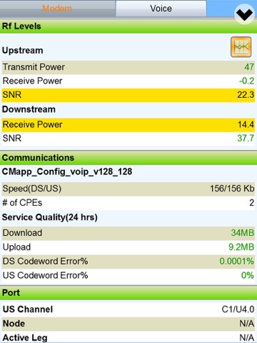 * Check historical data and compare nearby modems. With one touch you can chart the RF statistics for any modem over the last 24 hours. One touch more will overlay the same data from the five closest modems so a technician can compare readings and check for common trends or deviations. You can even stream RF levels to the charts live, which is useful for confirming whether a problem has been resolved, as well as for identifying intermittent and short-duration issues that might otherwise be missed.