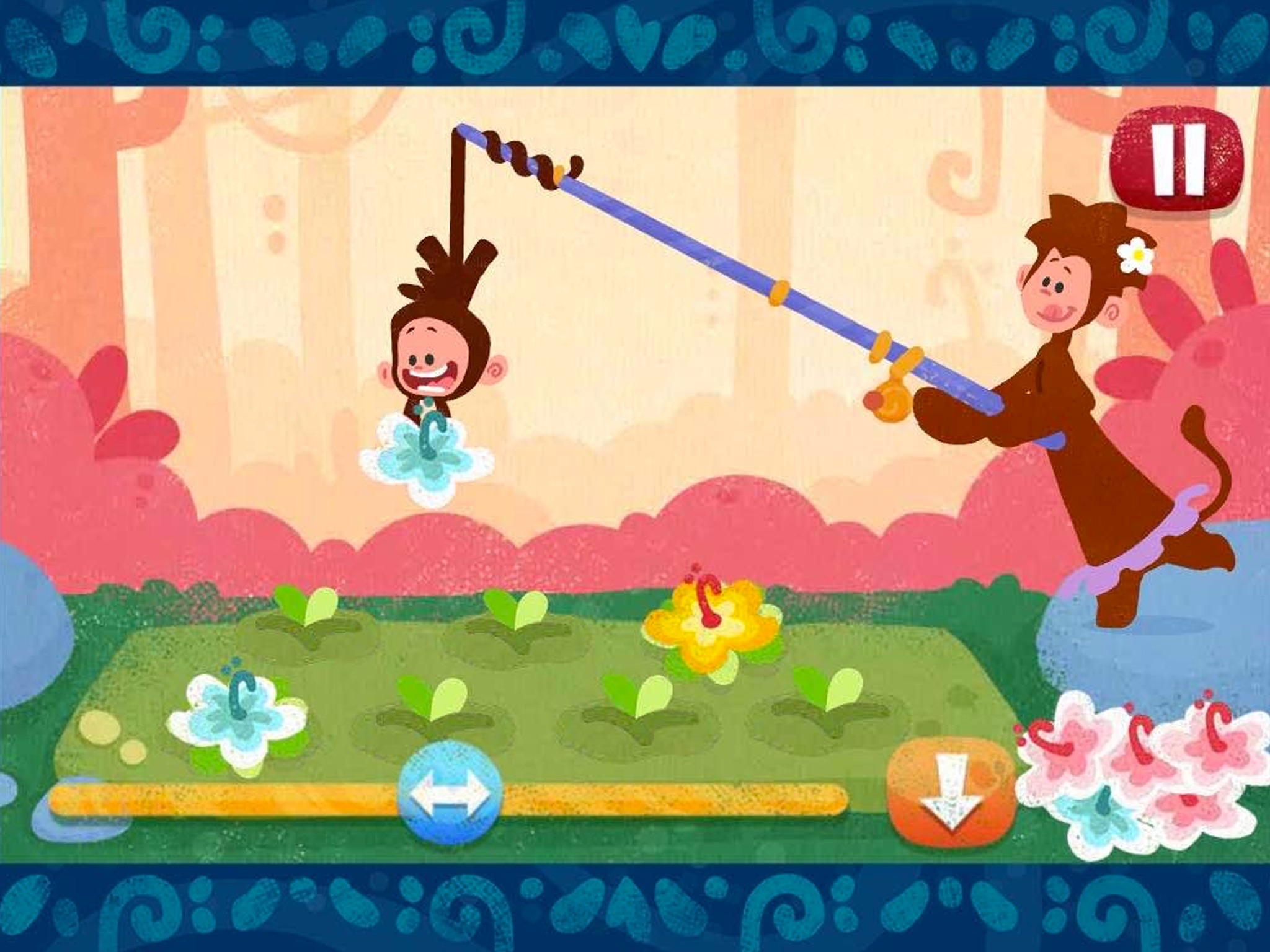 Tee and his friend, Fly are flying through the jungle trees to knock down the fruit for Mo to catch in her basket. Watch out for the branches!