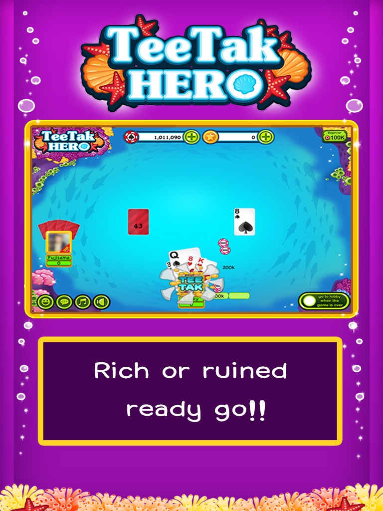 TeeTak Hero card game online in a brain training, you can join other players to play and send emoticon message during playback fun. Just enjoy your 4 cards with 1 card from midfield. Check your cards with midfield. The cards are not the same, you lose. But if the same and the more points you win. If youre sure to win, Select TeeTak and wait for a chance to win all of the money from midfield.