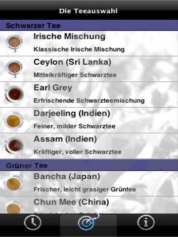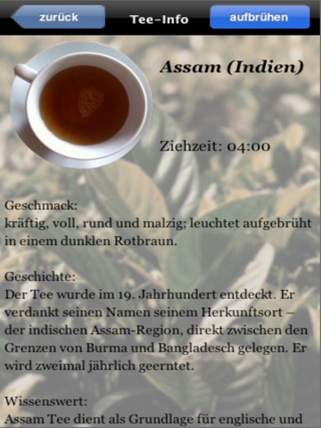 - 15 (version 1.2.0, 23 in 1.3.0) types of tea with short description and some hints for e.g. water temperature