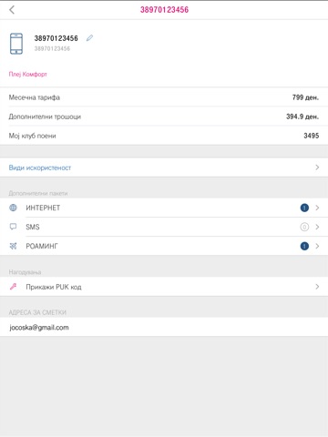 • Управувајте со сите услуги со едноставен преглед: разговори, SMS, роаминг, интернет пакети и фиксни услуги