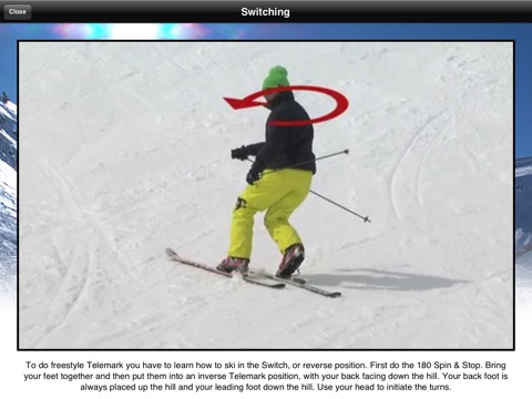 The SkiTips series of Teaching Apps for skiing and boarding sets new standards in Sports instruction, enabling skiers and boarders for the first time to take all of their instructional media out on the slopes with them. The Lessons presented in Telemark Tips cover every level of Free-Heel skiing from beginner right through to expert. Experienced Telemarkers returning to the slopes will benefit from working on the specific techniques in Chapters 4 and 5, while Intermediate skiers will want to work on Chapters 2 and 3 before starting to develop their advanced skills. The novice Telemarker will start in Chapter 1 and move forward through the lessons and Chapters at whatever pace suits them personally.
