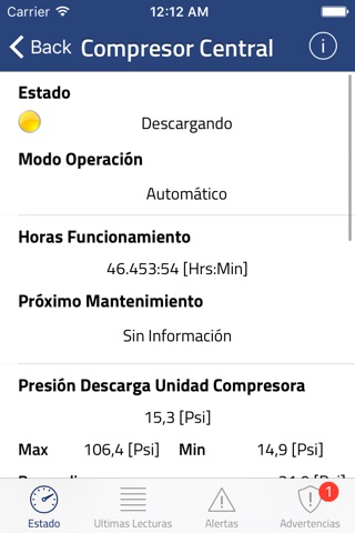 -Recibir alertas de estado, fallas ,presión, temperatura, horas de funcionamiento, mantenimiento, soporte.