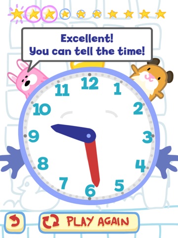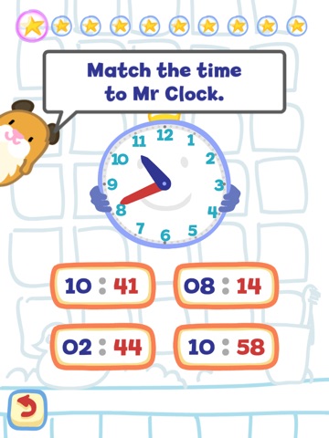 There are five learning stage levels ranging from just the first use of hour hands all the way up to full use of hours and minutes. At any time the child can also play with Mr Clock which allows the child to move the clock hands with their fingers and hear the time played back to them.