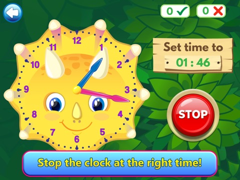 Choose a particular combination of hours and minutes, as the minute hand moves encourage your kid to press the stop button when the clock reaches the desired time. If the answer is correct you move on to the next task, if not, you try again. Or position the hands to set the correct time. If your kid gives three correct answers in a raw, it will get a star as a reward. Collect five stars and you get a dinosaur or a decoration for your virtual park. Cute dinosaur themed clocks and decorations will enhance kids motivation in playing free interactive telling time activities and collecting the stars will serve as a challenge so that they will play these learning games for toddlers and preschoolers more often and practice telling the time over and over again. Educational games for kids like Telling Time - Clock Games are a must, dont miss the opportunity to offer your child an easier way to learn!