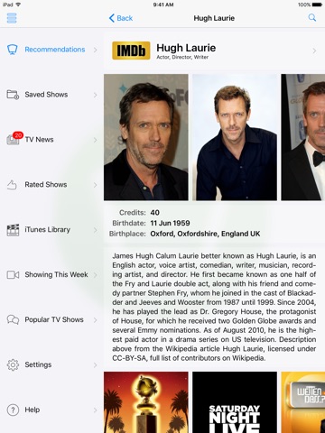 ● Intelligent TV show recommendations ● Compares TV show plots and style ● IMDb links ● Rate your iTunes TV show library ● Syncs across all devices ● All TV show info in one app ● From the makers of the popular ‘Movie Genius’ app ●