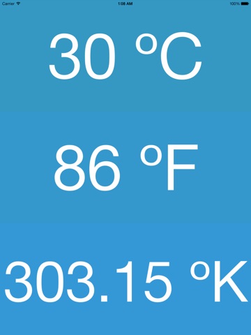 A simple and easy to use temperature converter. Swipe left or right on any of the readings to increase or decrease the values. Shake the device to reset. A short slide will change the temperature by 1, a medium slide will change it by 10 and a long swipe across the screen will change it by 100.