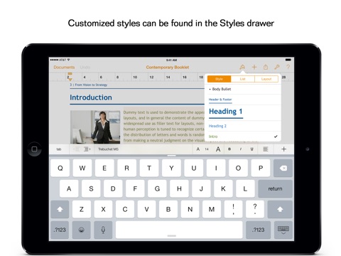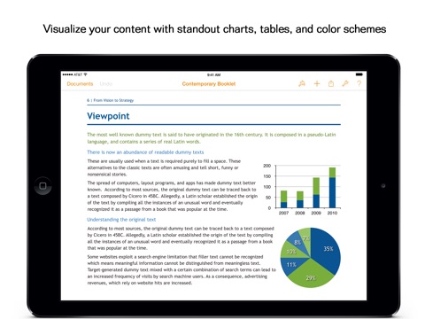 Tables and charts can be quickly updated, with time-saving presets including character and paragraph styles, color schemes, table of contents, multiple columns, headers and footers and more.