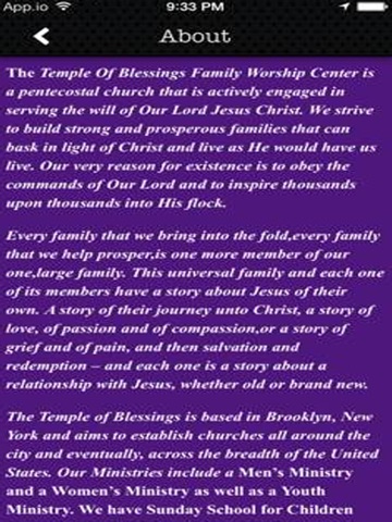 The Temple of Blessings Worship Center of Brooklyn New York App allows for deeper engagement into the life and media of our church. Our members can download our APP and communicate with our church and each other directly, listen to and watch sermons, get instantly notified of events.