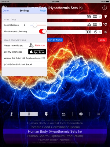 TempVerter DB is a temperature converter that also features a huge scientific temperature database. TempVerter DB converts temperatures to Fahrenheit, Celsius, and Kelvin on the fly as you type. The extensive built-in reference database contains over 220 important temperatures in the fields of astronomy, biology, chemistry, health, Earth science, climate change, physics, materials science, and more.