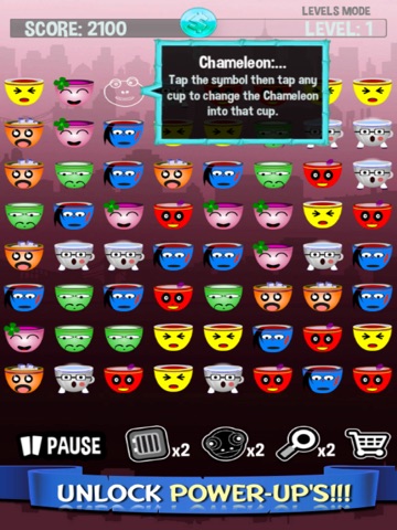 Match four cups to make one laugh. Match two more tiles with the laughing one, and watch all the adjacent tiles pop!