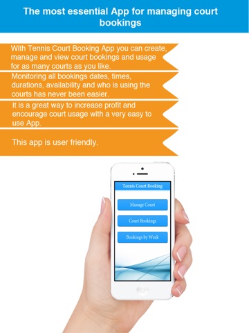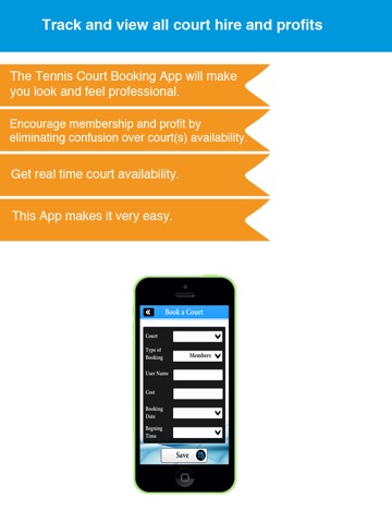 With Tennis Court Booking App you can create, manage and view court bookings and usage for as many courts as you like. It is quick and easy to use. Monitoring all bookings dates, times, durations, availability and who is using the courts has never been easier. It is a great way to increase profit and encourage court usage with a very easy to use App.