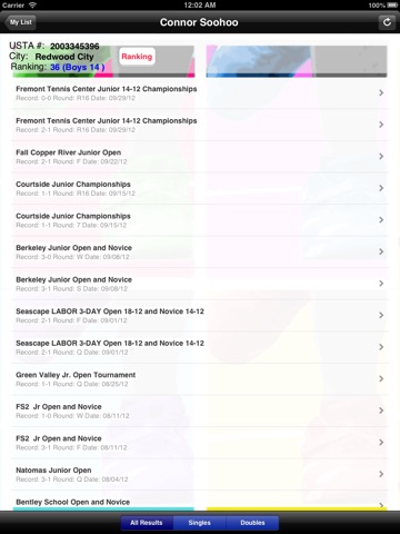 Tennis Frenemies PRO puts up-to-date USTA Norcal Tennis match results at your fingertips for any USTA Norcal Junior or Adult League player. For Junior players see their most recently played tournaments, results, and detailed head-to-head match results. For Adult players see their most recent teams, results, and detailed match results. Both singles and doubles match results are displayed. Easily search for and add your friends, your opponents, and even groups of players from academies.