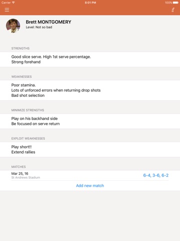 Create factsheets on your opponents, enter their weaknesses, their strengths. Think about the best ways to exploit these weaknesses and minimize these forces, in order to build a real game plan ensuring a plus for your next matches. Keep track of your game results, including specific notes.