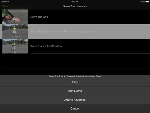 A special feature that we have included in the app is the ability to craft your own custom playlist of videos for your personal training and also a notepad where you can add notes for each video to help you remember the key points that will help you with your serve improvement or issues you may be facing.