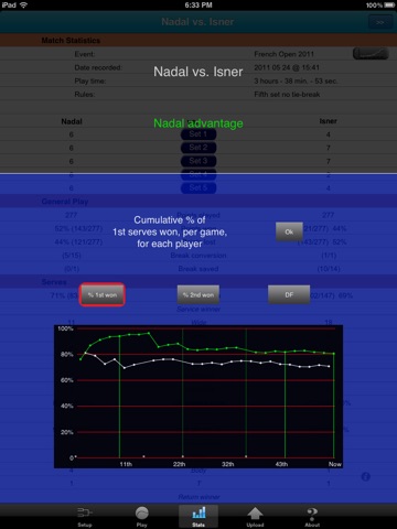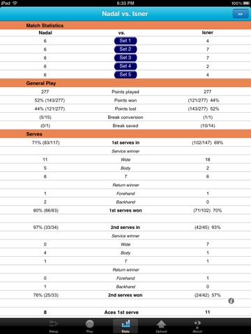 Superbe appli qui a déjà bien évolué depuis son lancement. Cest vrai quil serait judicieux de pouvoir déterminer le format exact (nombre de sets, de jeux, no ad, super tie-break). Mais LES STATS manquantes sont la faute directe en retour de service avec précision du coup (cd ou revers) et le PASSING-SHOT (à la limite si ergonomiquement il manque de la place pour ajouter ce coup, il devrait remplacer le LOB qui figurerait dans les différents passings). Bravo aux développeurs et en attendant avec impatience la version 1.39, joyeuses fêtes à tous!