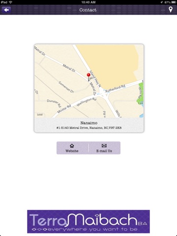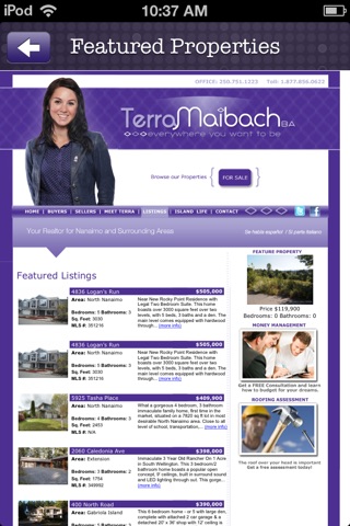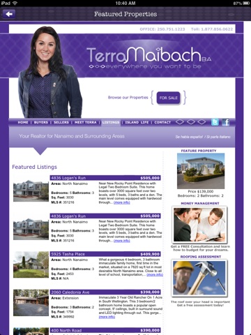 This app will provide a fun and useful experience for purchasers and sellers of real estate in the Nanaimo area. It will keep you connected to Terra throughout the process by providing quick access to helpful tools like One-Touch Calling, GPS Directions, Property Listings, Client Referral Form, Mortgage Calculator, Video, Social Media Sharing, App Analytics and Push Notifications.