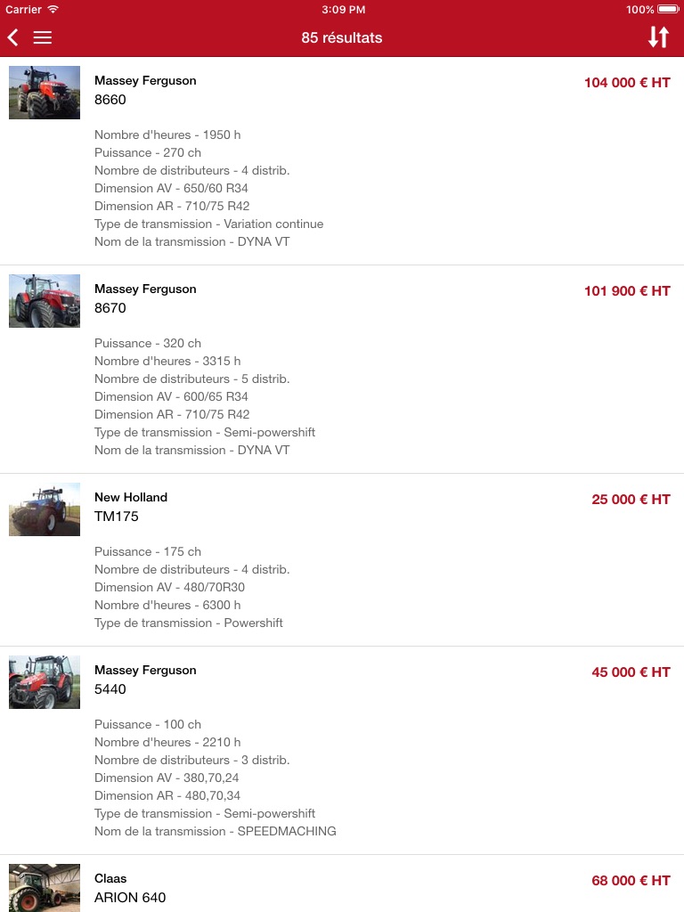 - Consultez, filtrez et triez vos listes de résultats avec le sphotos, les marques, le smodèles, les heures et les prix des matériels