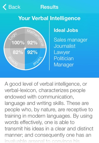 This report gives a detailed assessment of your strengths and weaknesses in the four identified dimensions (verbal, logical, mathematical and spatial intelligence).