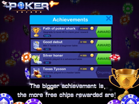 Whether if you are a rookie or an experienced poker player, you will find a table suitable for you. Come join the Texas Poker+ and connect with poker fans from all over the globe!
