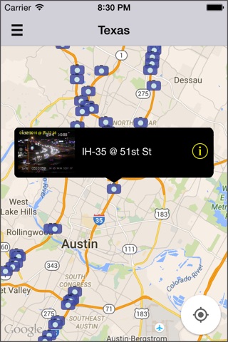 Texas Traveler shows you the current status of major roads and highways throughout the state. By accessing Texas Department of Transportation extensive road data, you can view traffic cameras, read alerts about construction and other road-related issues, get stats from weather stations, and read roadside signboard messages. You can also view flood stations and their current status around the whole state, as well as those numerous historical markers youve always been meaning to stop and read. Also available is Google Traffic, to show you how congested the roads are in real time.