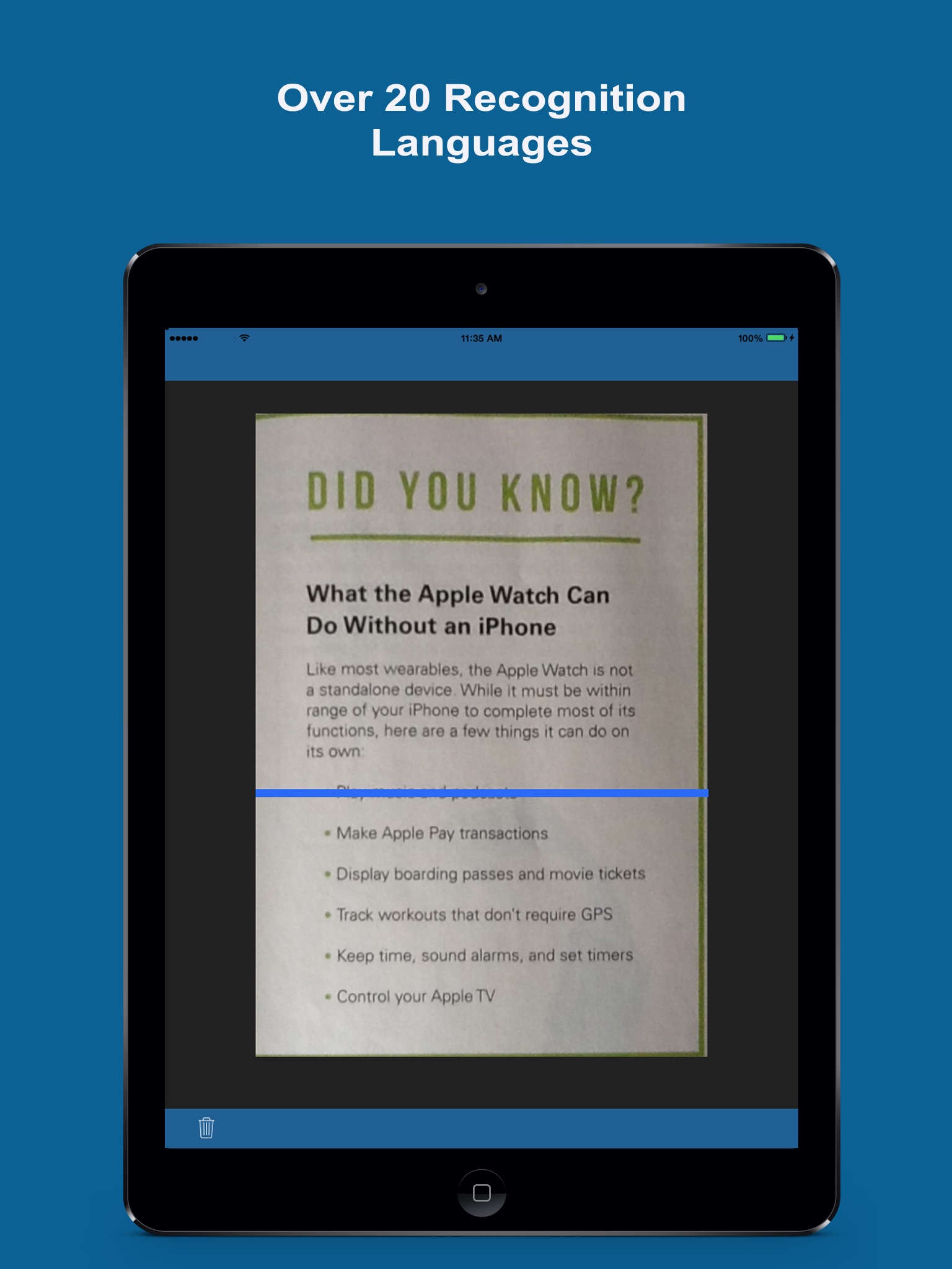 Direct the camera at any printed material such as books, magazines or ads and the app will automatically detect the edges of the document and instantly capture them. With auto crop the documents are automatically cropped with perspective correction.