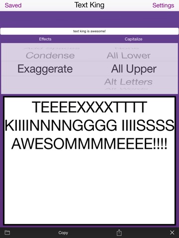 Text King is a great utility for configuring text. Instantly save, message, or share the results of your choices with the tap of a button. You can easily view your all time stats, saves, and usage history.