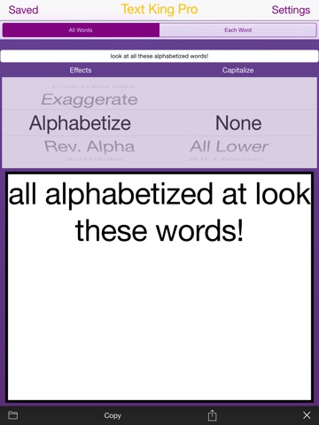 Many settings allow you to configure Text King Pro to your exact needs, including how many spaces to add and at what position, how many letters should be exaggerated, which letter should be capitalized first, and so on! In Text King Pro, you can adjust your settings for many of the effects while you work! No need to go deep into settings to configure all your preferences, the settings for most features will appear across the top as you use them, and Text King Pro will remember your settings!
