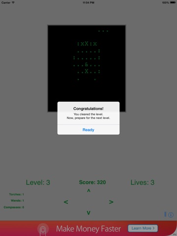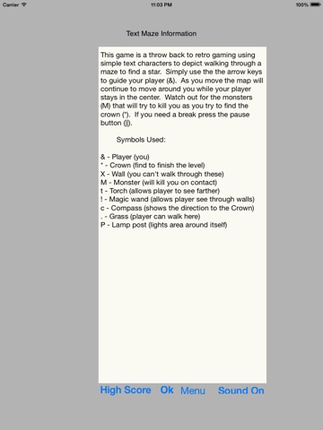 Text Maze is a great retro game invoking all the fun of the old Apple II games. In this game you explore various levels of a random maze looking for a crown on each level represented by a "*". Each level will become larger and increasing more difficult as you explore. There are several objects you can find to help you on your quest and at least one monster looking to stop you.