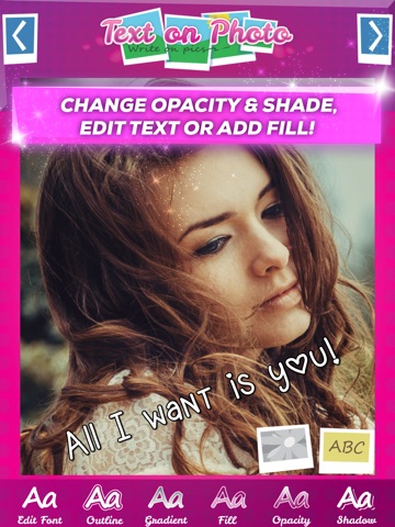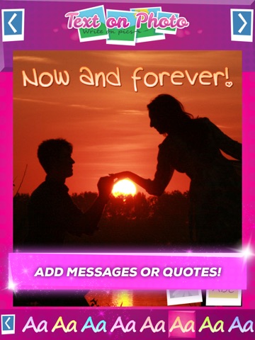 If you are bored with old-fashioned picture frames and effects, but still like photo montage, its time for you to try out this photo editing software with cutest girly fonts and vibrant colors for the text! See why it is one of the top photo editing apps for mobile phones and tablets. It has never been easier to write on pics thanks to the app to write on photos which now you can download for free. Dont miss this opportunity, write text on photos instantly, edit pictures like a pro, and set Facebook or Instagram on fire with your funny quotes or quotes about life. Text on pics photo booth will become irreplaceable part of your daily routine! Download and you wont regret it, Text on Photo Write on Pics will do wonders for your pics!